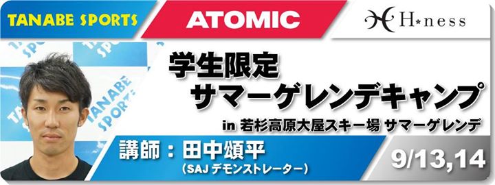 タナベスポーツでは9/13,14に 学生トレーニングでお手伝いいただいている 田中 頌平 (Shohei Tanaka)デモによる 『学生限定サマーゲレンデキャンプ in若杉高原おおやスキー場』 を開催いたします。 サマーゲレンデを使い夏の間の スキルアップを目的に行います! クラブの合宿としてもご利用いただけます。 30名様限定ですが ぜひご参加お待ちしております。 くわしい内容とお申し込みはタナベHPをご覧下さい https://www.tanabesports.jp/event/2017/08/23/26612/