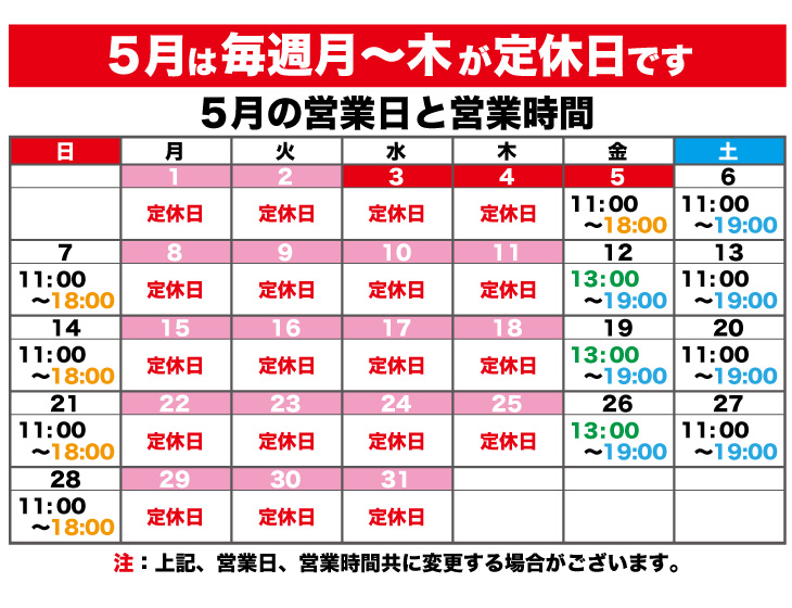 5月の営業日と営業時間のお知らせ(2023/04/23)